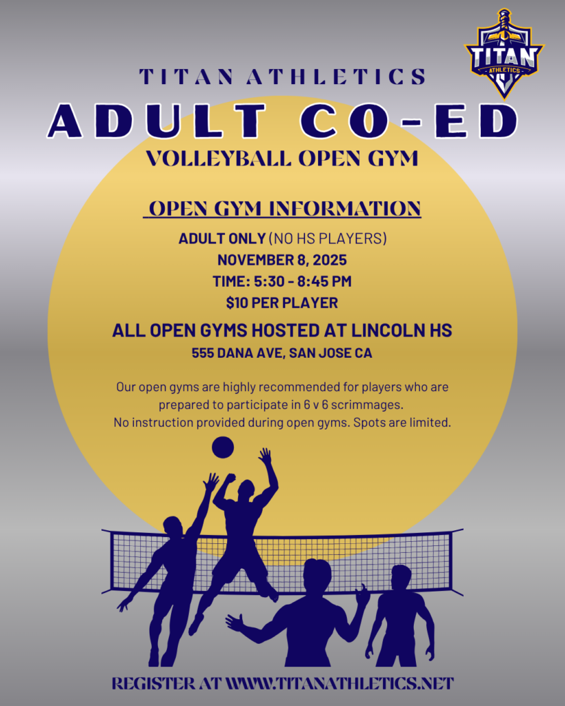 2025 Adult Co-Ed Volleyball Open Gyms Open gyms are highly recommended for players who are prepared to participate in 6v6 scrimmages. No instruction provided during open gyms. Space is limited. Please register HERE to reserve your spot! Cost: $10 per session Where: Lincoln High School, 555 Dana Ave, San Jose, CA 95126 Time: 5:30-8:45pm (ADULTS…