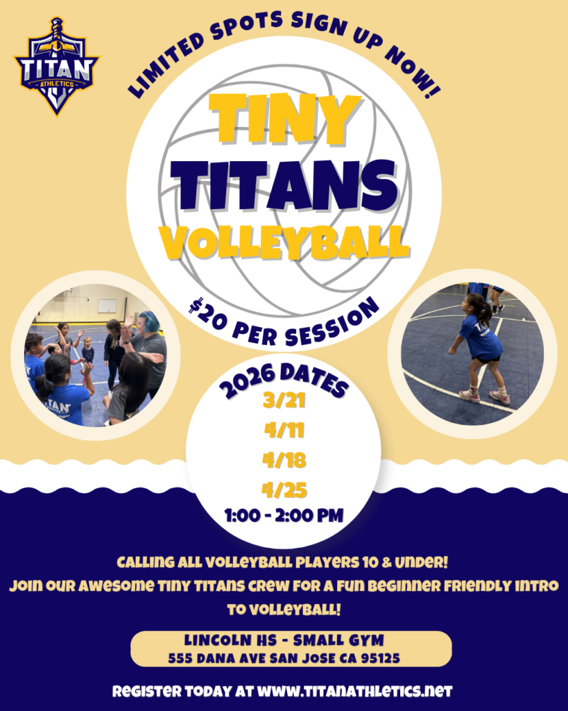 2026 Tiny Titans Volleyball Clinics — 5 sessions available! Each session consists of 60 minutes of instruction from our coaching staff designed focus on fundamental volleyball skills. Register HERE for Summer Tiny Titans Clinics Cost: $20 per session Where: Lincoln High School, 555 Dana Ave, San Jose, CA 95126 Who: Boys & Girls, 10 &…